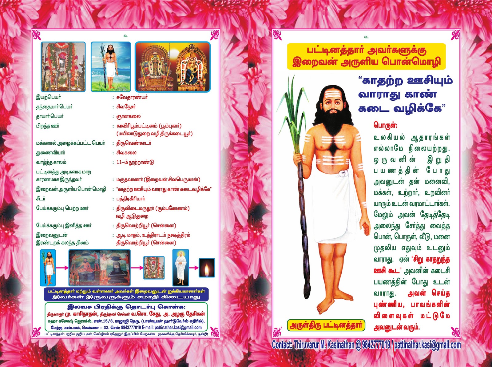 பட்டினத்தார் பாடல்களிலிருந்து முக்கிய 31 மேற்கோள்கள் இந்த அக்டோபர் மாத காலண்டரை அலங்கரிக்கின்றன.