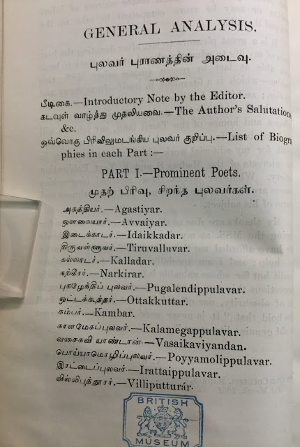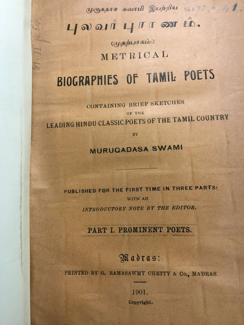 புலவர் புராணம் நூல் பற்றி இந்த பிளாக்கில் 2018-ல் பதிவிட்டேன். முருகதாஸ் சுவாமிகள் , கவிதை வடிவில் எழுதிய அந்த நூலில், 72 தமிழ்ப் புலவர்கள் /கவிஞர்கள் பற்றிய சுருக்கமான வரலாறு உள்ளது. 350 பக்கங்களுக்கு மேலுள்ள இந்த பெரிய சைஸ் புத்தகத்தை கடந்த சில நாட்களாக ‘பேஸ் புக்’கில் பதிவிட்டு வருகிறேன். சில ஆராய்ச்சி மாணவர்கள் தங்கள் எடுத்துக் கொண்ட ஆராய்ச்சிக்கு இது உதவும் என்று சொல்லி எனக்கு எழுதி முழு புஸ்தகத்தையும் கேட்டனர். ஈராண்டுகளாக வைரஸ் காய்ச்சல் தாக்குதலினால் பிரிட்டிஷ் லைப்ரரிக்குச் செல்ல முடியவில்லை. இப்போது நிலைமை முன்னேறியுள்ளதால் முழு புஸ்தகத்தையும் போட்டோகாப்பி எடுத்து வெளியிட்டு வருகிறேன்.