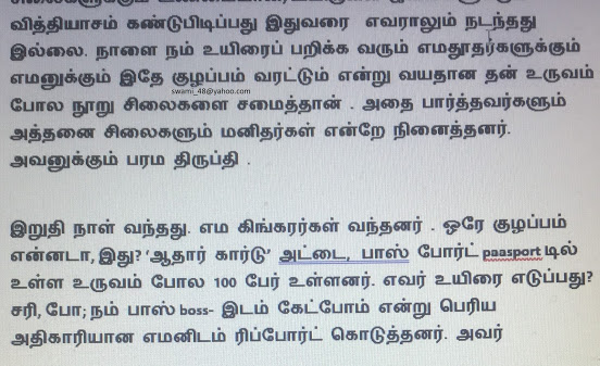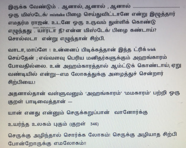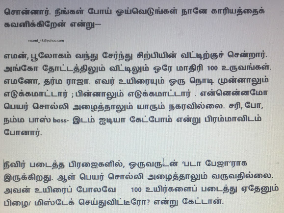 சித்திரகுப்தன் யார்: யமனுடைய காரியதரிசி ஒரு தனி ஆள் அல்ல. சித்திரகுப்தன் என்றால் ‘’ரகசிய வரைபடம்’’ என்று தமிழில் பொருள். நாம் எண்ணும் ஒவ்வொரு எண்ணமும் செயல் வடிவம் பெரும் முன் சித்திரமாகப் படியும். அப்பொழுதே யமன் நமக்கு மதிப்பெண் போட்டு விடுகிறான். அதன் படியே, புண்ணிய பாபங்கள் ஏற்படும். அதன் அடிப்படையில் நாம் நரகத்துக்கோ, சுவர்க்கத்துக்கோ செல்கிறோம். இதையே சித்திர குப்தன் (ரகசிய=குப்த, வரைபடம்=சித்திர) என்போம். ஒரு கம்ப்யூட்டரும் மூளையும் கோடிக் கோடி கணக்குகளைப் போடும். சித்திரகுப்தன் கணக்கு சூப்பர், சூப்பர் கம்ப்யூட்டருக்கும் மேல்!