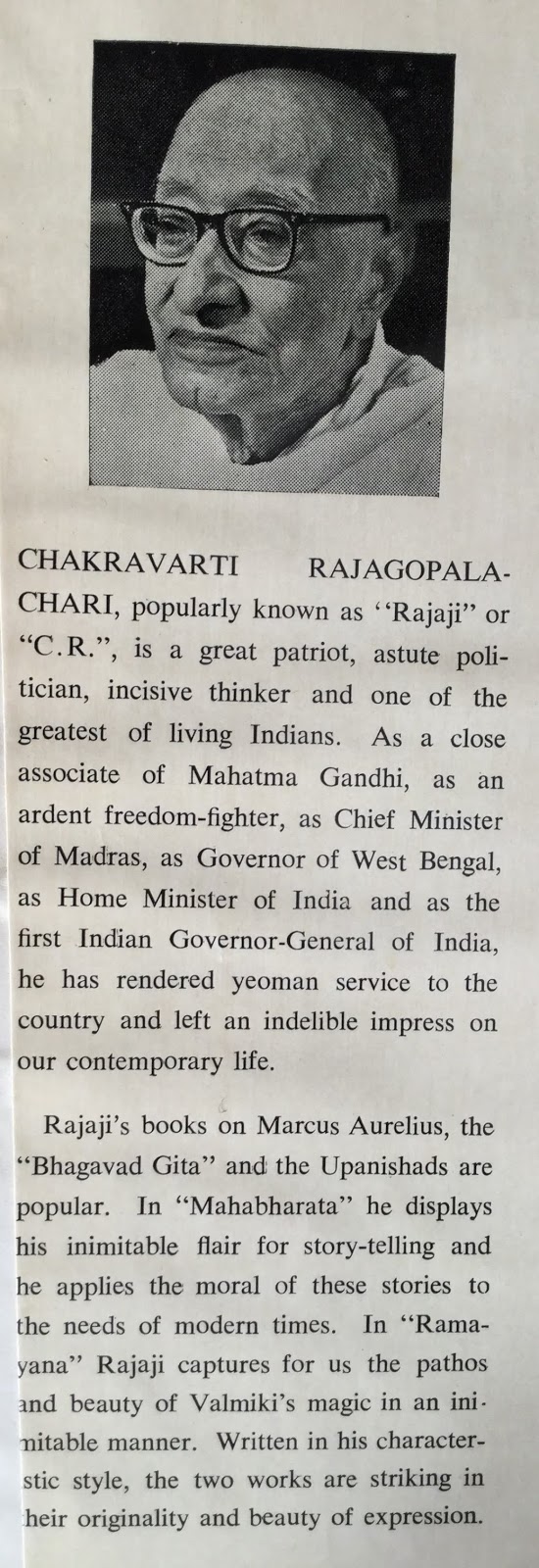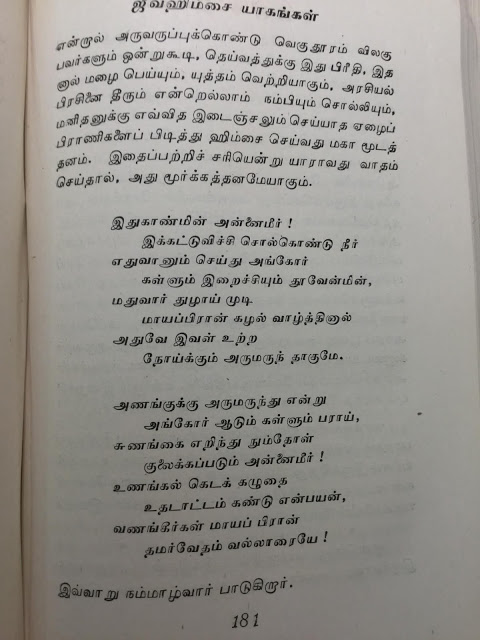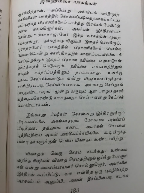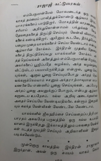 சக்ரவர்த்தி ராஜகோபாலாச்சாரி என்ற பெயருடன் ராஜாஜி எழுதிய கட்டுரைகளின் தொகுப்பு காரைக்குடி புதுமைப் பதிப்பகத்தால் 1944-ம் ஆண்டு வெளியாகியது. அதில் யாகத்தில் உயிர்ப்பலி பற்றி மஹாபாரதம் கூறும் விஷயத்தை ராஜாஜி நமக்கு அளிக்கிறார். இதோ அந்த இணைப்பு:-