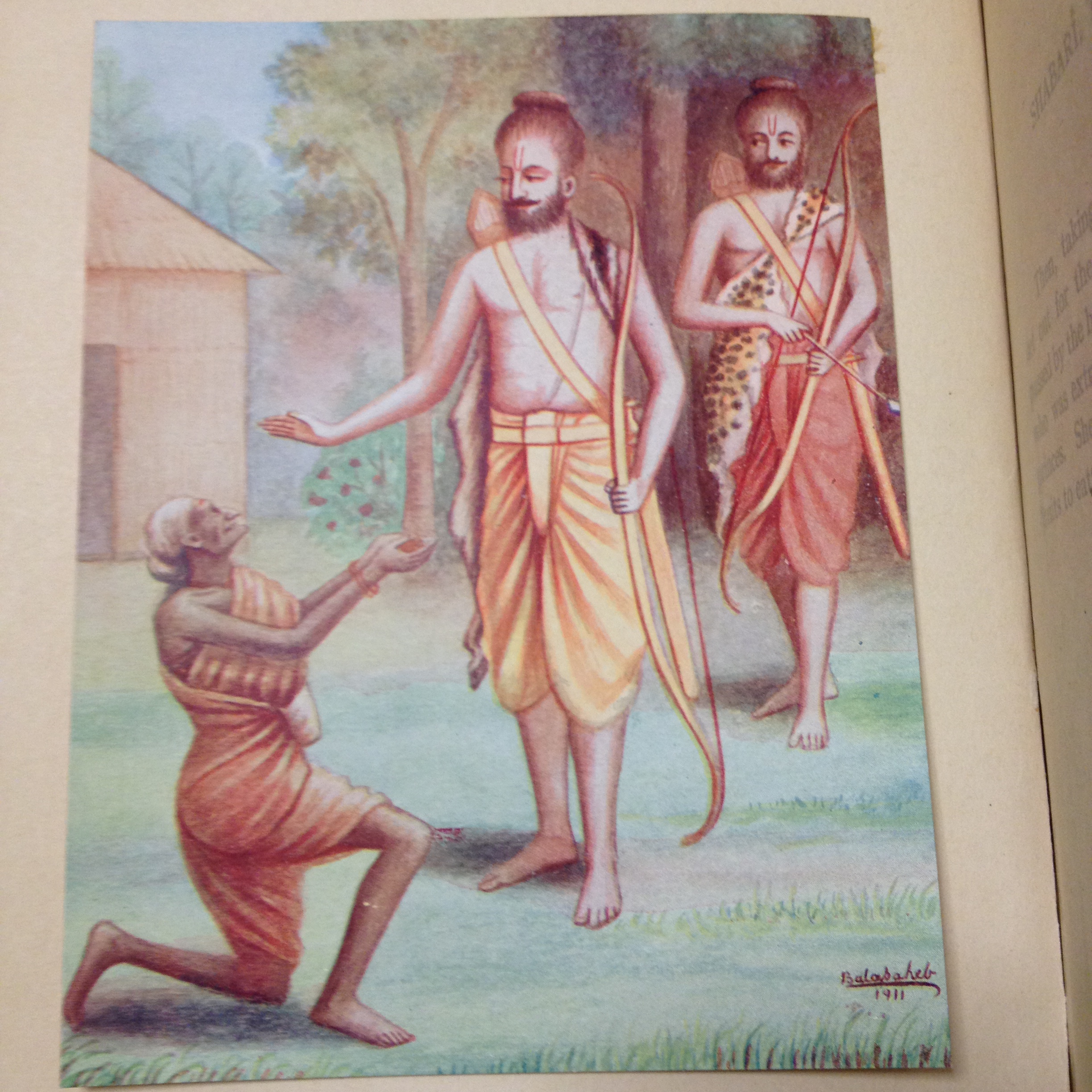 படம்1.ஒரு வேடன் , ஆணும் பெண்ணுமாகக் கூடியிருந்த இரு பறவைகளில் ஒன்றை அம்பு எய்து கொன்றான். அதைப் பார்த்த வால்மீகி அவனைச் சபித்தார். அந்த சாபம், அவர் அறியாமலே கவிதையாக மலர்ந்தது. உடனே பிரம்மா தோன்றி, நீ ராமன் என்னும், உத்தம அரசனின் கதையை எழுதலாமே என்றார். அப்பொழுதுதான் உலகம் வியக்கும் வால்மீகி ராமாயணம் தோன்றியது. 24,000 செய்யுட்களாக வடிவெடுத்தது. (பறவைகளைக் கொல்வது வேடர்களினன் தொழில். ஆயினும் ஆணும் பெண்ணுமாகக் கூடியிருக்கையில், எந்த மிருகத்தையும் கொல்லக் கூடாதென்று, இந்துமத நூல்கள் தடை விதிக்கின்றன).