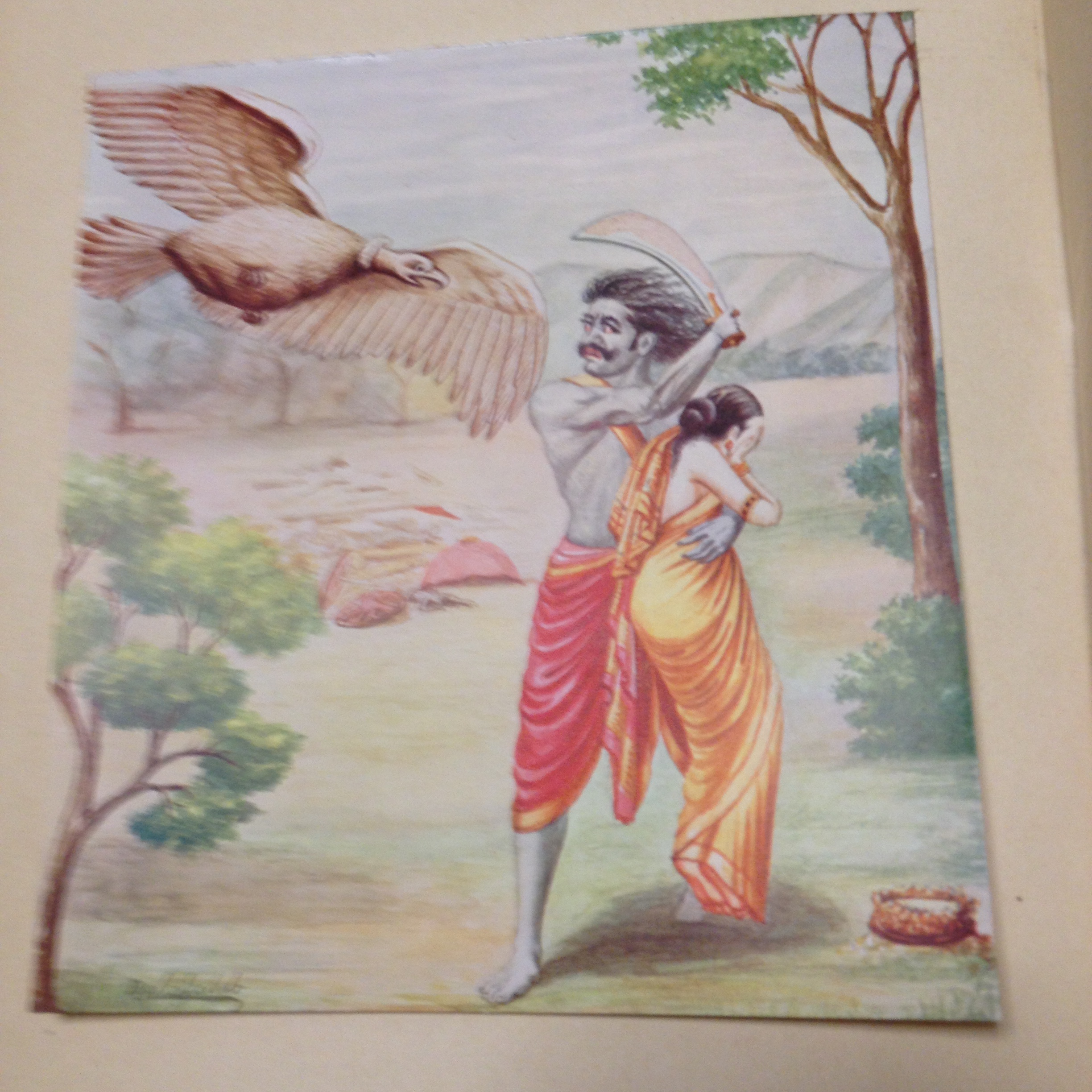 படம்5.காட்டில் நுழைந்தவுடன் தாடகை என்னும் அரக்கி வருகிறாள். “பெண் என்பதால் நான் கொல்ல மாட்டேன்” – என்கிறார். அவளொரு பெண்ணே இல்லை , இராட்சஸி என்று விசுவாமித்திரன் சொன்னவுடன் ராமன் அவளை ஒரே அம்பில் கொல்கிறார்.