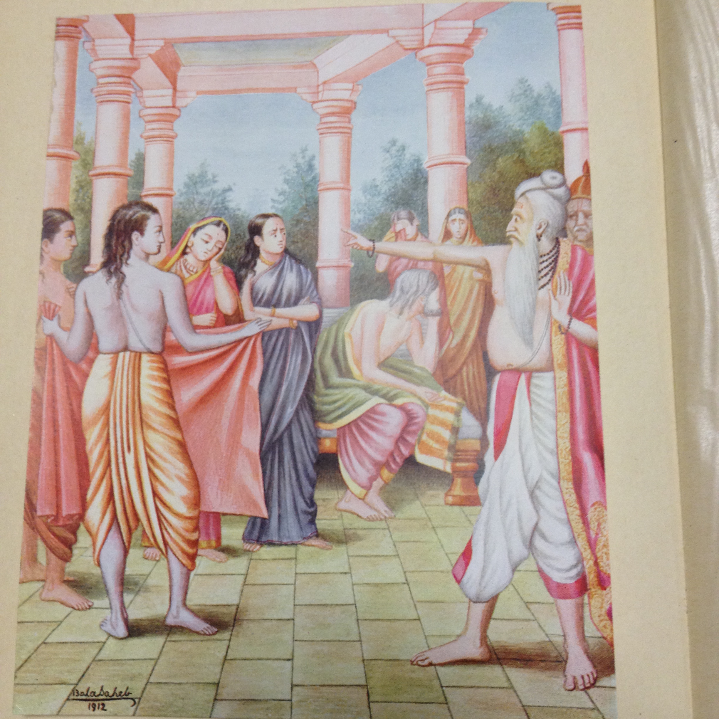 படம்4.விசுவாமித்திரனென்ற முனிவன் ((விசுவ+மித்திரன் = உலக நண்பன்)) வந்து, உனது மகன் ராமனை என்னுடன் பாதுகாப்புக்காக அனுப்பு என்கிறார். தசரதனுக்கு பயம், நானே வருகிறேனே, சின்னப் பையன்கள் எதற்கு? என்கிறார். ஆயினும் வசிஷ்டர் சொன்னவுடன் ராம லெட்சுமணர்களை அனுப்பி வைக்கிறார். முக்காலமும் தெரிந்த முனிவன் வசிட்டனுக்கு இதிலும் நண்மை உண்டு என்று தெரிகிறது.