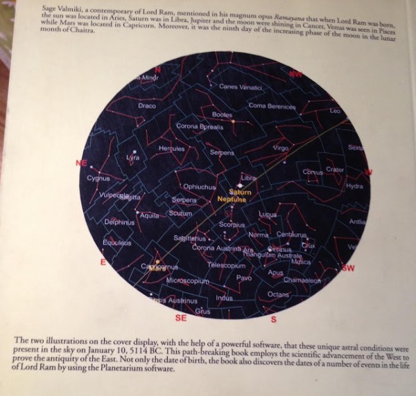 He has concluded that Rama lived around 5100 BCE on the astronomical evidence in the Valmiki Ramayana. First let me give his conclusions and then his introduction. It is a book with sixty colour star maps. His conclusions are