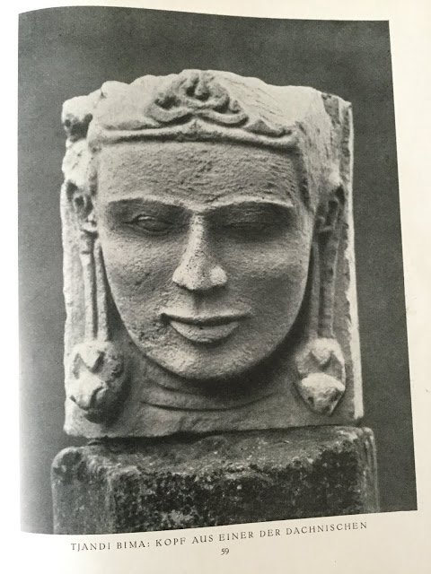 The image of Agastya occupied the south chamber of the shrine, and so also follows the standard of the Central Javanese pantheon. However his head dress has undergone some changes compared to the image at Prambanan. In Central Java the sage waesr the Jatamukuta associated with ascetics devoted to Shiva in Indian tradition, whereas in the East Javanese period the sage wears a turban like head dress which is also found very prominently on priestly figures in the narrative reliefs of East Java, and in Ketu headdresses of priests depicted in the wayang style of painting in Bali.