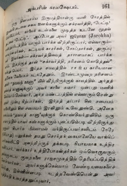 13.ஒவ்வொரு நாளும் இரண்டு முறை மக்களுக்கு தரிசனம் கொடுப்பார்; காலைக் கடன்களை முடித்தவுடன் ‘ஜரோகா’வில் அமர்ந்து எல்லா திகாரிகள், துருப்புகளையும் சந்தித்து நலன் விசாரிப்பார்.