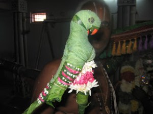 In Srivilliputtur, a parrot is made every day with leaves and kept In the left hand of goddess Andal. At the end of the day, It is given to devotees who believed it would bring good luck to them.