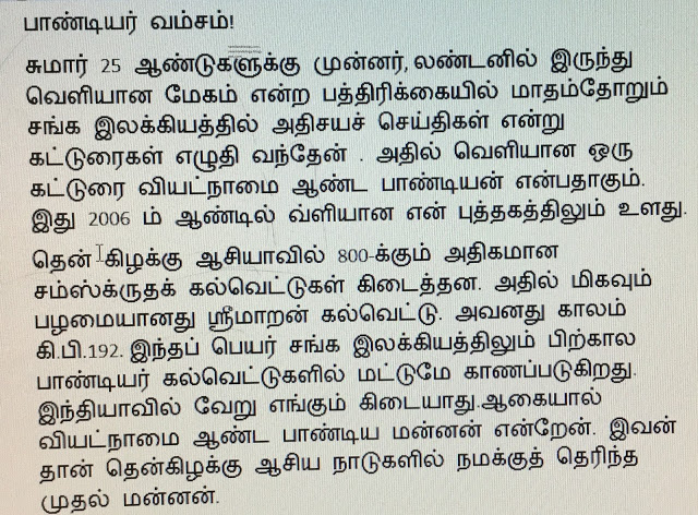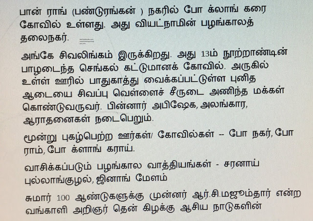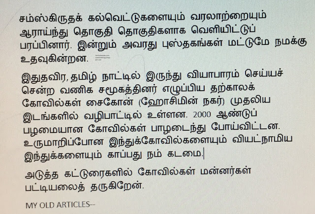 Over 1250 inscriptions are discovered so far in South East Asian countries. Majority of them are in Sanskrit language. Ancient Cambodia, known as Kingdom of Khmer covered most of the area in South East Asia. Champa, what is now known as Vietnam, has the oldest Sanskrit inscription. Since the name on the inscription is Sri Mara, I have interpreted it as the name of a Pandyan king in my research article “A Tamil king who ruled Vietnam” — posted here on Sept 13 , 2011. This is what I wrote,