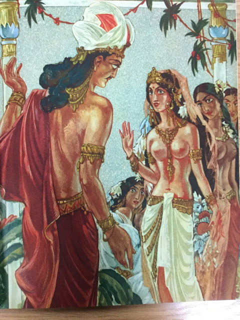 Damayanti fell in love with a king named Nala. But the heavenly deities Indra, Agni, Varuna and Yama also wanted to marry her. Hindu women of the warrior caste (Kshatriyas) had the greatest freedom in the ancient world and they had chosen their own husbands. It was called Swayamvara. All the kings would get invitation letters. When Nala also attended it, the four Vedic Gods dressed themselves just like Nala and attended the Swayamvara ceremony. When the beauty Damyanti entered the decorated hall she was perplexed by seeing Five Nalas there. Immediately she used her power and prayed God to identify the Real Nala. tamilandvedas.com, swamiindology.blogspot.com