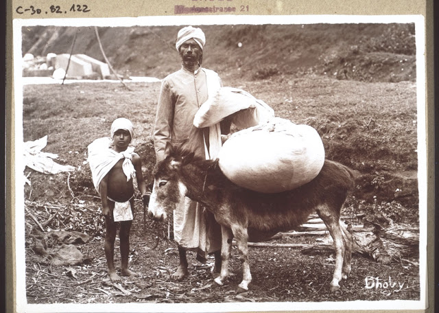 Now the children go to find the donkeys, who are to carry the loads of bleached clothes back again to their home. The dhoby and his wife bundles themselves carry bundles of clothes on their heads and on their backs; they go slowly back to their village.