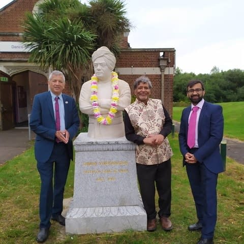 A vision of the late and former Mayor Cllr Mrinal Choudhury, who passed away on 1 August 2020, the statue was unveiled by The Mayor of Harrow Ghazanfar Ali. Deputy Mayor Sasikala Suresh, Manmeet Singh Naran, Minister for Coordination at the Indian High Commission and Swami Sarvasthananda of Ramakrishna Vedanta Centre, UK were also present.