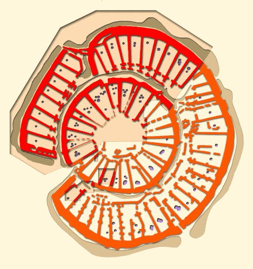 The settlement covers an area of some 220,000 square feet (20,439 square metres) and consists of two circles of dwellings separated by a street, with a central community square in the centre.