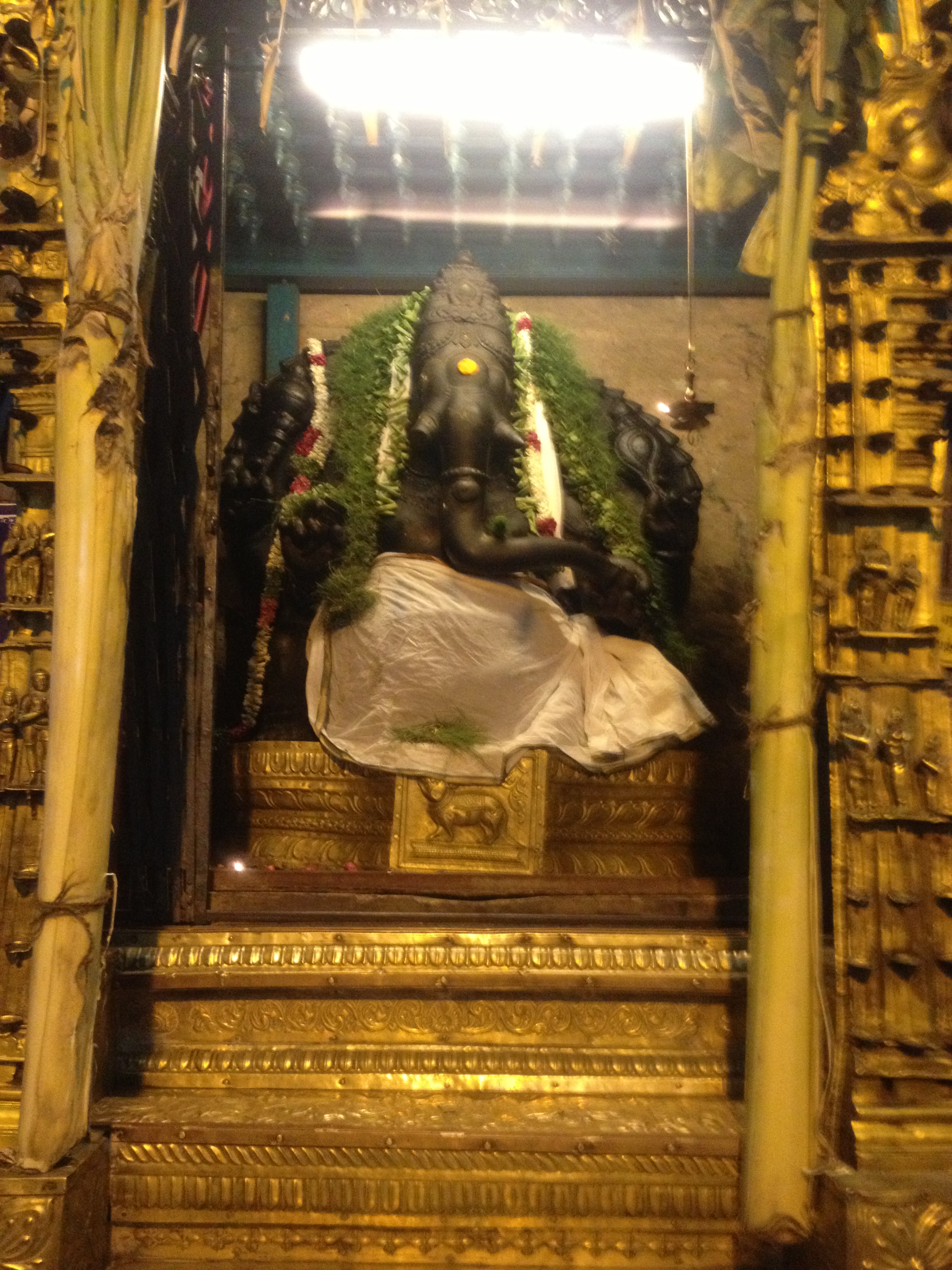 · There is big statue of Lord Ganesh inside the temple. This 6 X 4 feet statue was discovered when the Nayak king was digging the earth for sand and stones for the temple. A big (Mukkuruni) kozukkattai or modak made up of 18 kilo rice and several kilos of jaggery/sugar is offered to it every year on Ganesh Chathurthy day. Kozukkattai or Modak is a steamed rice offering inside which is Puranam made of coconut or other grains.