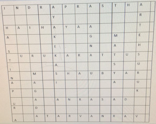 AT LEAST 13 PLACE NAMES FROM THE MAHABHARATA ARE IN THIS CROSS WORD; IF YOU CANT IDENTIFY WITHIN 30 MINUTES THEM LOOK AT THE ANSWERS.