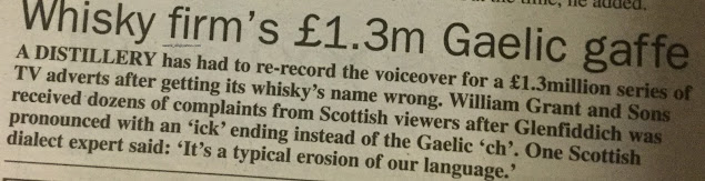 Sometimes even wrong pronunciation may cost you much. Here is another paper cutting with whisky news with wrong pronunciation.