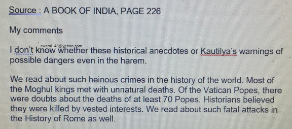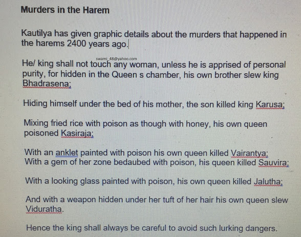 Kautilya has given graphic details about the murders that happened in the harems 2400 years ago. He/ king shall not touch any woman, unless he is apprised of personal