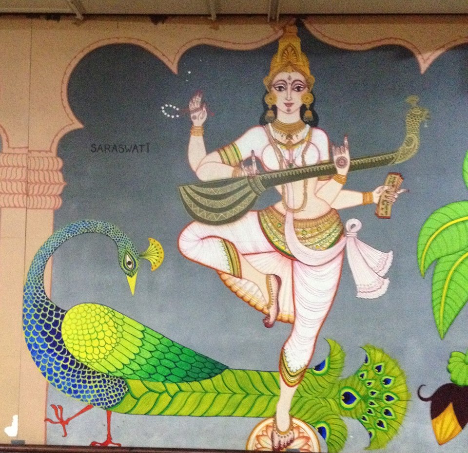 Sarasvati : Veena (musical instrument), rosary, books, vase, flute; swan or peacock is shown as vahana.