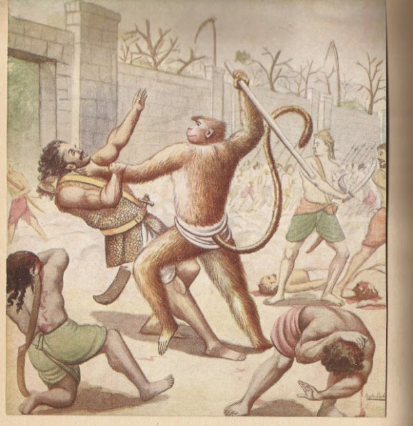 Ravana never dreamt Rama would come over so soon after the dismissal of Vibhishana, and was astonished to see that he was already on the soil of Lanka. Climbing the wall of the rampart he began to observe the number of the foe. Rama too was attentive to Ravana’s movements. When Sugriva recognised Ravana standing on the rampart, he jumped over to him and knocked off his crown at a blow. Soon they began to wrestle, and at first Sugriva got the better of his opponent. But at length Ravana exerted his magic powers and Sugriva was forced to relinquish his hold. Both the combatants returned to their respective camps.