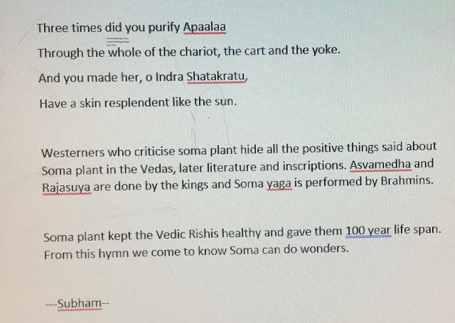 Here Sayana gives some interesting details about Soma herb. Its leaves grow for 15 days in the bright half of month and dies in the next fifteen days in the dark half of a month. So, Soma is punned with Soma/moon because of this quality. Now we know the reason Soma herb is named after Soma, the moon because of this. Hindus always link Moon and the growth of plants, unlike others. Scientists couldn’t agree with us.