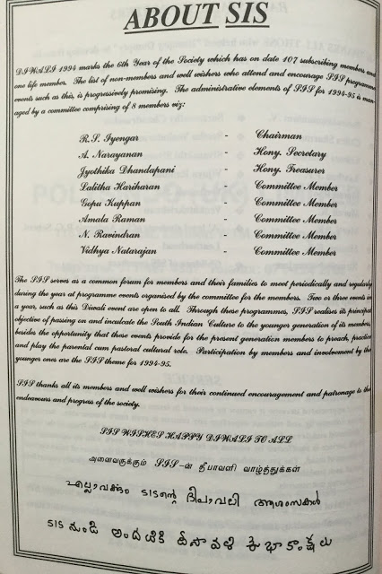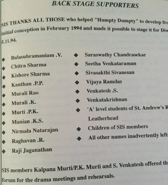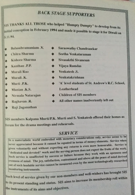 Mrs Sita Venkatraman, Mr Vedanarayanan, Ritu Sarmaji, Mr Kanthan, Mr Krishnaswami, Mr Sambamurthy, Mrs Jaya Srinivasan and a few others formed a drama group London Kalaik Kuzu and staged a drama during Deepavali at YMCA under the Chairmanship of Mathur Sri Krishnamurthy of Bharatiya Vidhya Bhavan, London. Each one of the actor and actress spent his or her own money to stage the dramas in the beginning.